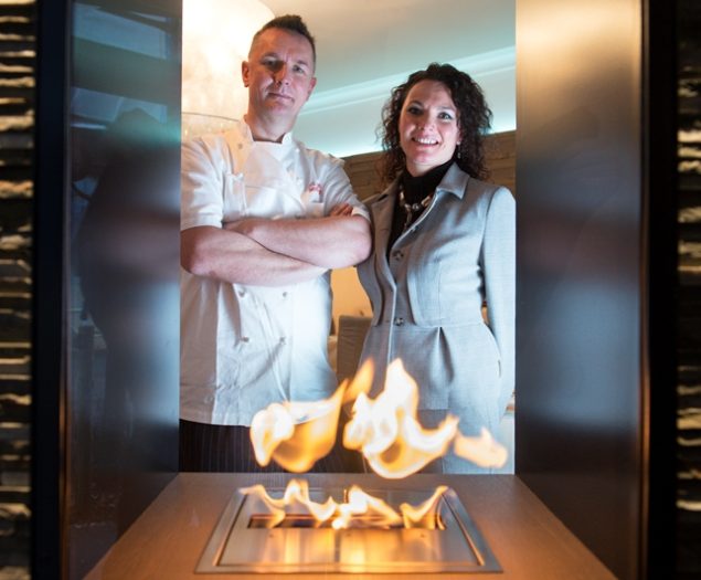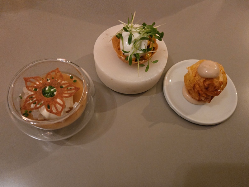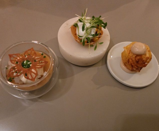 We opteren voor het vijfgangenmenu met aangepaste wijnen. De amuses worden eveneens in het salon geserveerd en bestaan uit een Kaassoes, een Vichyssoise met selder en gelei van ossenstaart, een Tartelette met gegrilde maïs en geitenkaas en een krokant van bintje-aardappel met gerookte mayonaise. Hoewel de presentatie verzorgd is, misten we hier nog wat de persoonlijke signatuur van de chef.