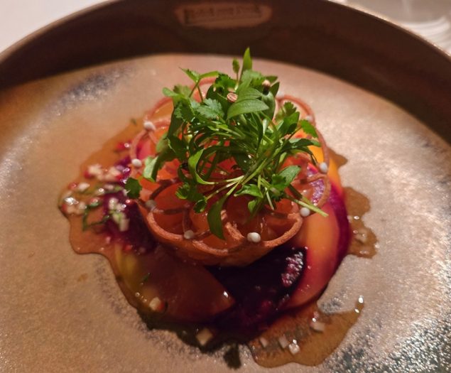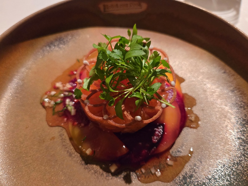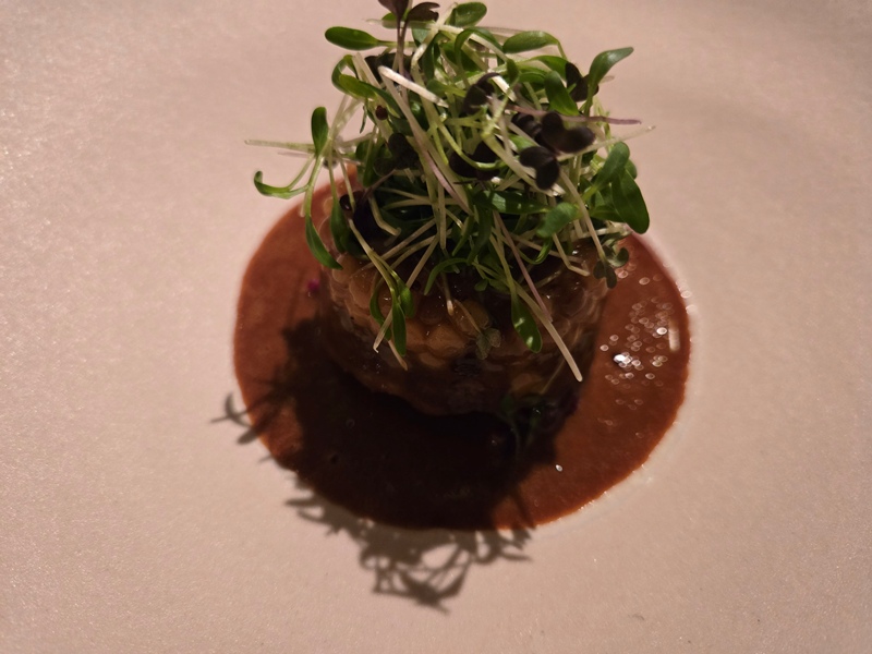 Het eerste voorgerecht is een Gravlax van “Wester Ross” edele zalm uit biologische Schotse kweek, geserveerd met Nam Jim-saus (Thaise barbecuesaus met koriander), rode biet, mango en Ghoa-cress die met een citrussmaak en geur van koriander het geheel nog accentueert. Een fris, mooi gepresenteerd en evenwichtig gerecht. De Nam Jim-saus zorgt voor een aangenaam zuurtje en vormt samen met de bite van de rauwe rode biet een geslaagde combinatie, al had de zalm iets fijner gesneden gemogen voor mijn persoonlijke smaak.