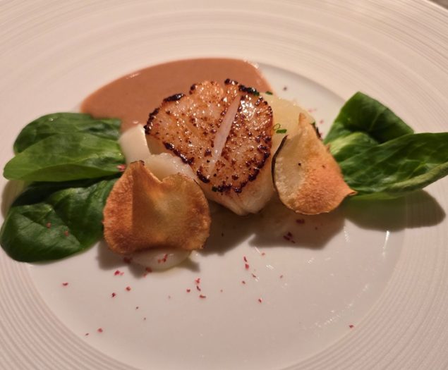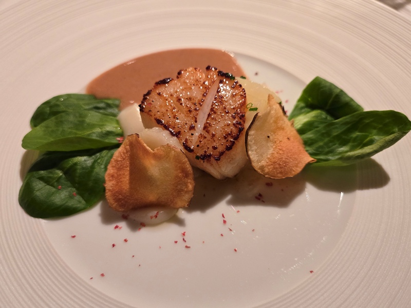 Daarna volgt een Sint-Jakobsvrucht met een dashi-jus met pinda’s, afgewerkt met aardpeer en tarwesalade. De coquille is perfect gegaard en goed afgekruid. Chef Pankert weet opnieuw een klassiek bord te presenteren. De jus van Dashi met pinda’s was voor mij iets te uitgesproken van smaak. De aardpeer, op drie verschillende manieren bereid, vormt een mooie aanvulling en getuigt van vakmanschap.