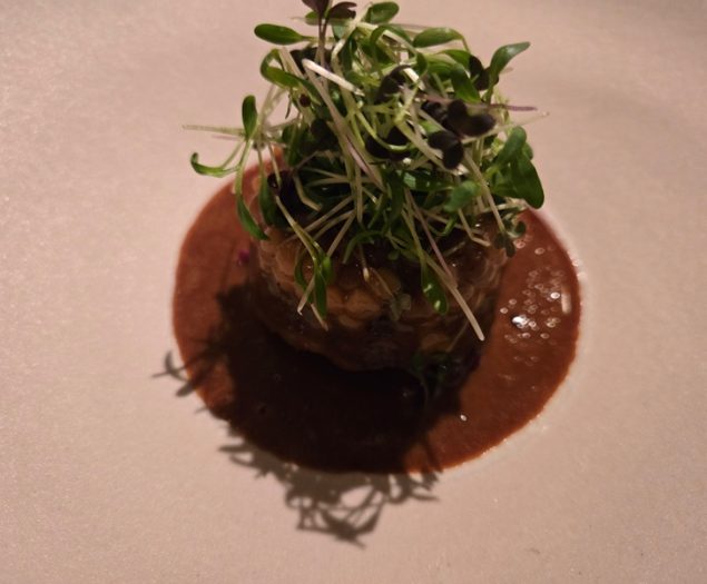 Als tussengerecht krijgen we Hazenpeper met fregola sarda, huisgemaakte rode kool, mosterdscheuten en walnoten. De presentatie is strak en elegant in een wit bord. De smaakvolle jus en de rode kool brengen hier een aangename diepgang bij de drogere haas.