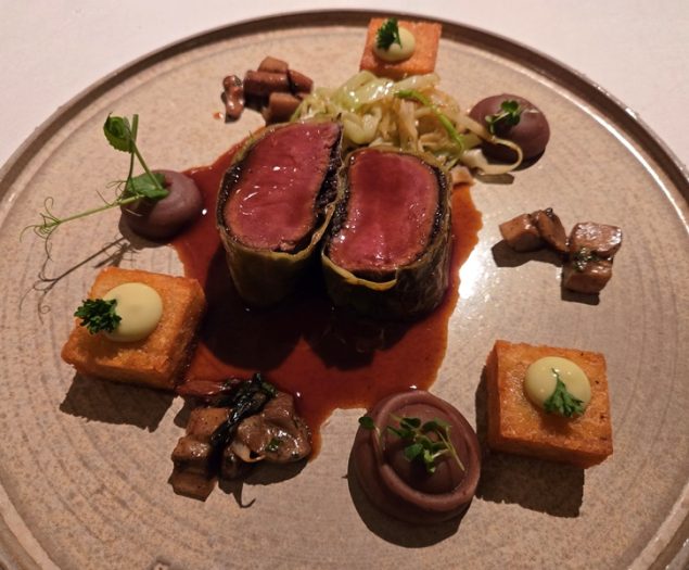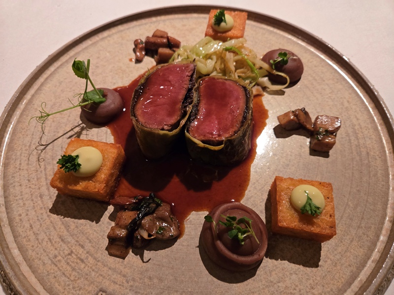 Het hoofdgerecht is zonder twijfel een hoogtepunt: Hertenfilet met spitskool, eekhoorntjesbrood, rösti en kastanjepuree. Alles is perfect in balans, prachtig afgekruid en de cuisson van het hert is perfect waardoor boterzacht. De chef komt persoonlijk aan tafel om het gerecht af te werken met een intense, overheerlijke jus, wat de beleving alleen maar versterkt.