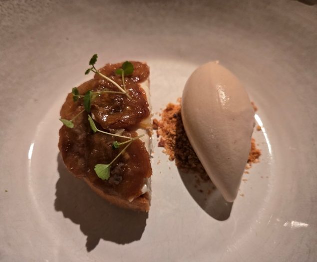 Het dessert, een Bananendessert met tonkabonenijs, sluit het menu af, gevolgd door een fijne, lekkere thee met bijhorende mignardises. Het bananendessert had voor mij iets pittiger gemogen na het sterke hoofdgerecht.